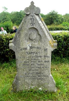 (inside gate, turn left, immediate second grave against the west wall of churchyard) "In loving memory of/ HANNAH/ beloved wife of HENRY BULL/ of Cubley/ who died July 31st 1908/ aged 53 years/ Not My Will, but Thine also be done/ Also of/ HENRY BULL/ who died Feby 20th 1921/ Aged 75 years."10'