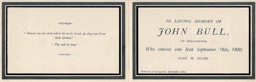 / In / Loving Memory of / John Bull / of Hollington / who entered into rest Sept. 1900 / Aged 76 years / Also of / Mary Ann, wife of the above / At Rest March 3rd. 1901 / Aged 76 years / photograph of grave taken by mfj.11
